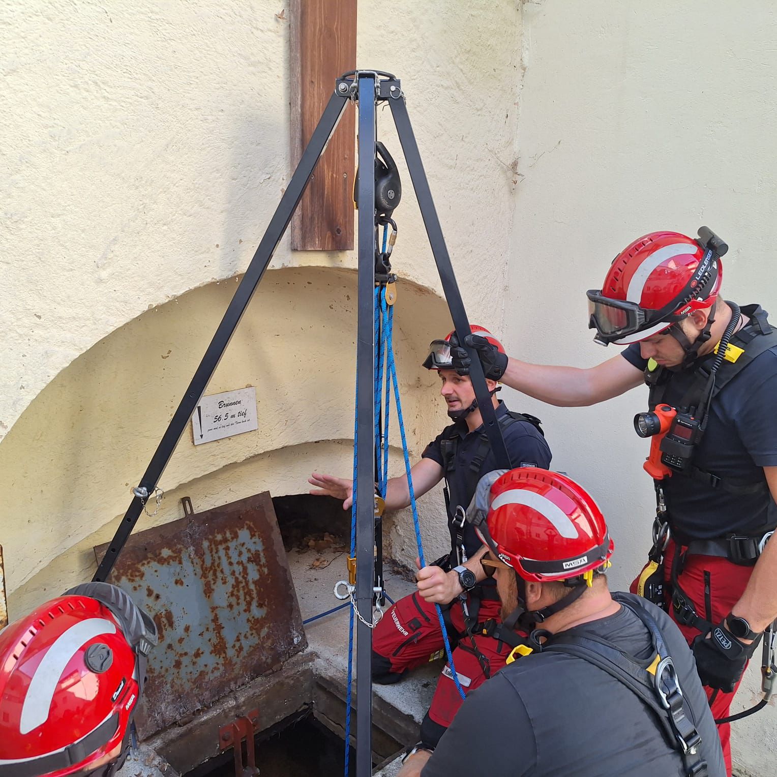 Schachtrettung: Rettung einer hilflosen Person aus einem engen Schacht mittels Flaschenzugsystem.